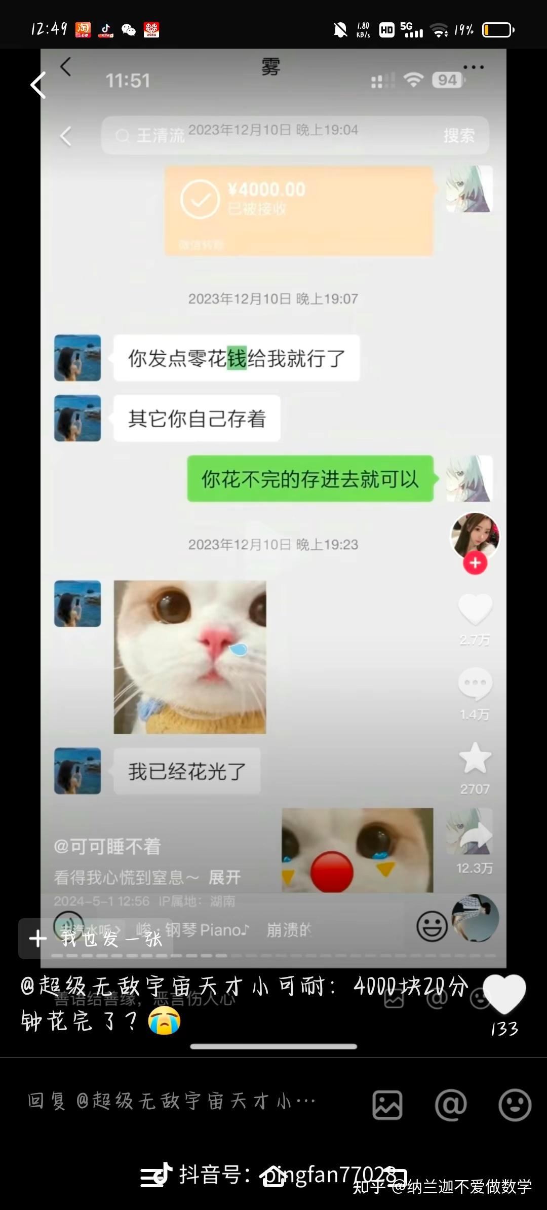 4000块钱20分钟就花完了……关键是这个男生不是富哥,这些钱是男生省吃俭用天天没日没夜地代打出来的钱,是他的血汗钱,捞女一下子就把它给花没了,男生下面发的那个猫猫表情包真的好令人心疼……