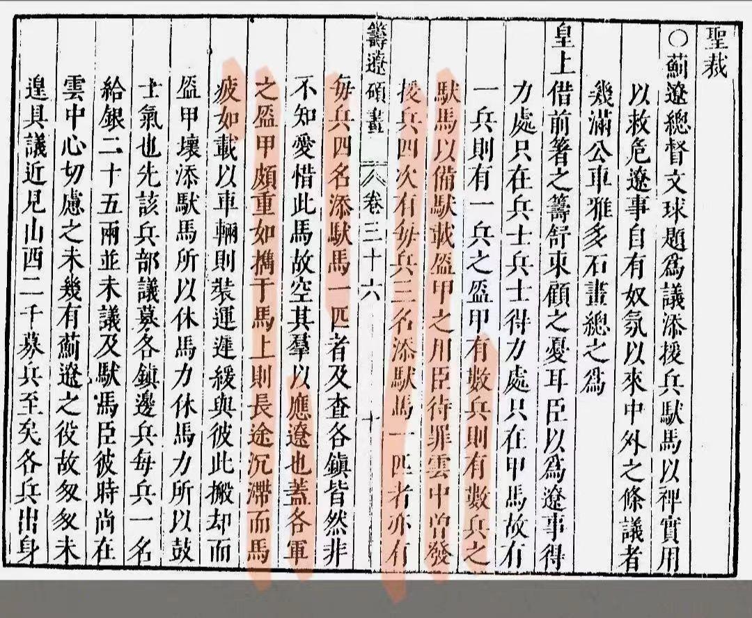天启三年七月,顺天巡抚岳和声在《餐微子集》卷二中的议拨兵饷疏中称,马兵应优先发铁甲,而步兵则需以皮甲、纸甲、棉甲这类轻便无铁的甲胄为主。