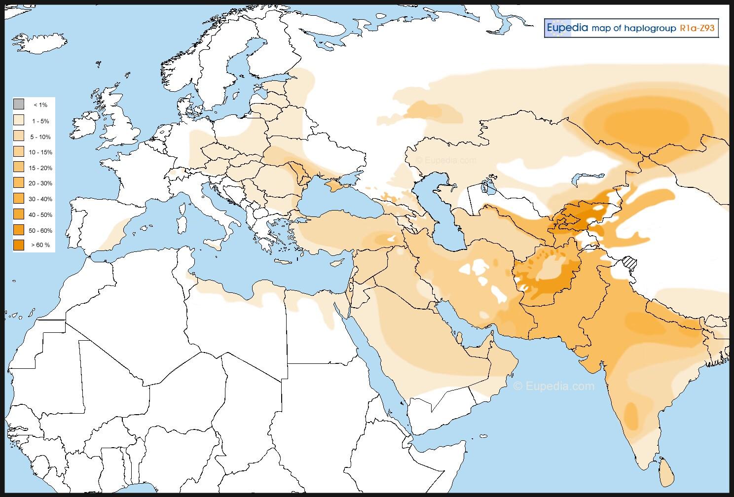 这是R1a的亚洲分支的分布频率图: