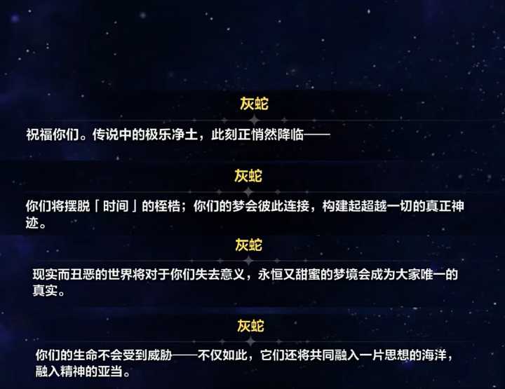 所以干脆找个能承受得住崩坏的东西(比如圣痕),“代替”人类成为这个载体,生活在地球上就好了。圣痕的存在甚至比人类更为优越、更为完美——而人类本身也在梦境中得到了永恒的平和与安宁。
