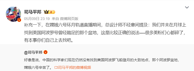 怎么看“嫦娥六号进入环月轨道的直播中,总设计师说没有找到美国阿波罗号登陆的那个盆地”??