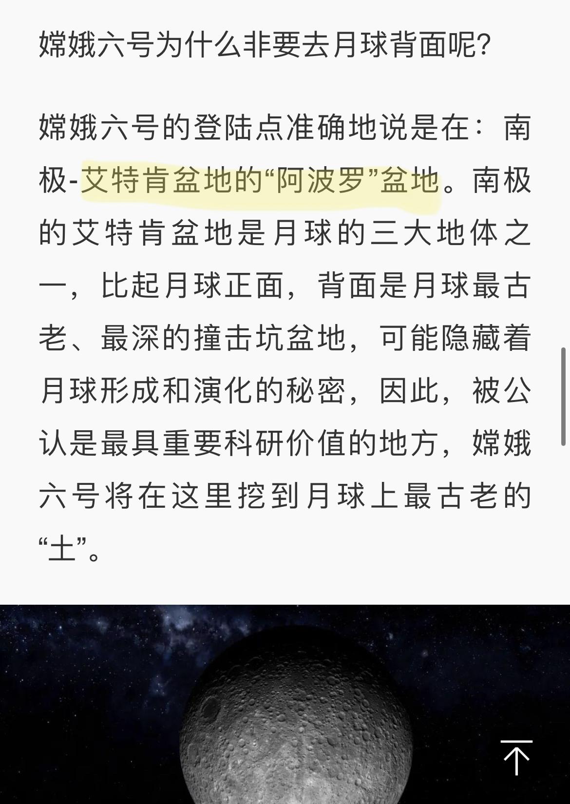 嫦六这次准备落月的地点叫阿波罗盆地,在月球南极的背地面,美国阿波罗的所有落月点都在向地面,差了十万八千里,所以专家是不可能提到阿波罗落月地点的。阿波罗盆地位于上次嫦四落月的艾肯盆地内,也是嫦四的备选落月点,所以主持人问专家嫦四嫦六登月位置的区别,专家应该还没想好怎么回答,个人估计应该是想说上次嫦四登月没找到阿波罗盆地的合适位置,所以改落在了冯卡门撞击坑,结果主持人接话了,就没说下去。