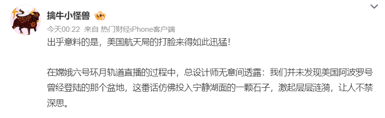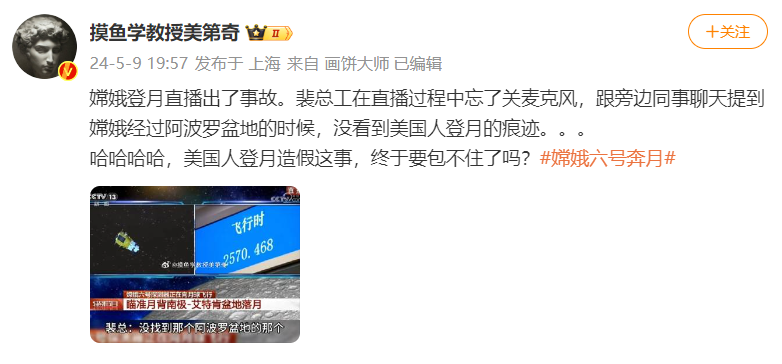 还看到有登月阴谋论信徒避重就轻,说这是什么专家口误造成的乌龙,再次提醒一下,这件事就是纯纯的造谣,根本不是什么乌龙,专家完全没有口误,说的就是“阿波罗盆地”一个字都没错!阿波罗盆地是月球地名,是嫦娥六号原计划落月的盆地,在月球背面,而五十年前阿波罗计划的所有降落地点都在月正面,阿波罗盆地和阿波罗飞船八竿子打不到一起,差了十万八千里。专家说没找到原计划降落的阿波罗盆地,登月阴谋论教徒厚着脸皮把专家说的阿波罗盆地当成阿波罗遗迹到处造谣,造这类谣的登月阴谋论教徒简直是毫无航空航天常识毫无底线。
