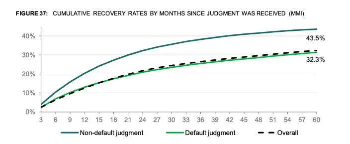 来源:https://files.consumerfinance.gov/f/documents/cfpb_consumer-credit-card-market-report_2023.pdf?mod=article_inline 在各方因素的影响下,美国信用卡公司确实拿一部分「老赖」没啥办法。上图显示的是美国消费者金融保护局(CFPB)发布的 2023 年信用卡违约统计数据,其中可以看到,在获得有利判决后的 60 个月,信用卡发行商平均只能收回 30% 的债务,七成的欠款就真的「黄鹤一去不复返」了。