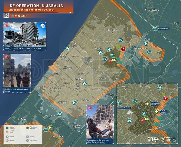 在进攻加沙北部贾巴利亚市三周后,以军30日晚开始撤退(下图绿色箭头)。城镇大部分地区现在已没有了以色列人。