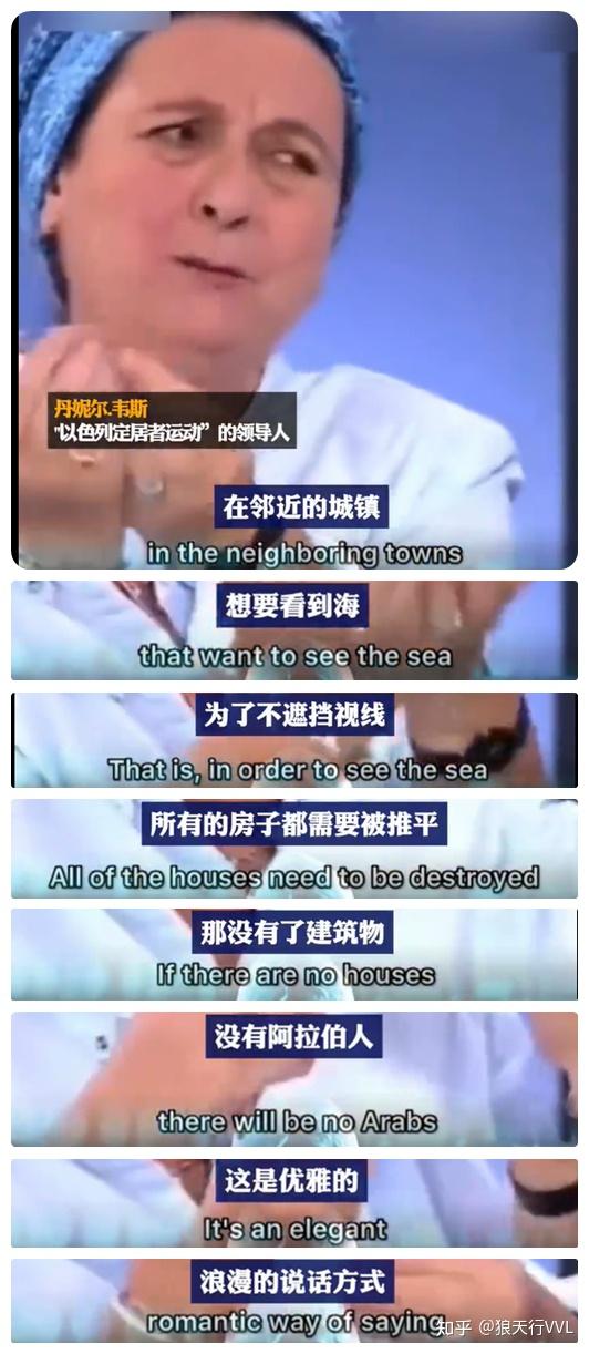 比如,以色列极右翼政治团体,“以色列定居者运动”领导热,丹妮尔·韦斯最近公然表示:我们要把加沙当地阿拉伯人都赶走,要建立一个“犹太加沙”,其中重要理由之一是“想看到海”,而且“为了不遮挡视线”,必须“把房子推平”!