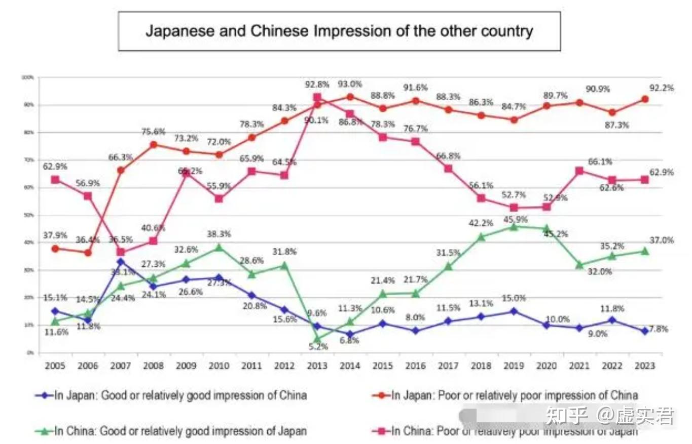 2023年的一次民意调查中显示,有92.2%的日本人对中国有坏印象,而只有62.9%的中国人对日本有坏印象。