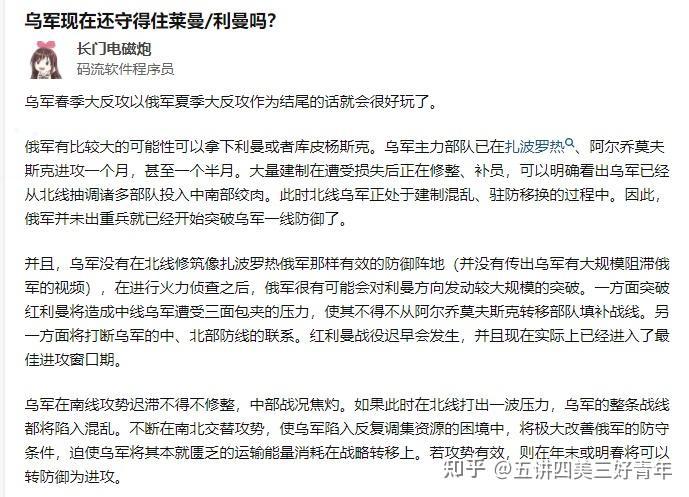 马林卡、恰索夫亚尔、巴赫穆特都通过激烈争夺啃下来了,但乌军丢失了这些战略要地,战线从3月到现在却只有边际改善,没有当年乌军大反攻时狂飙突进的景象。到现在俄军也没...