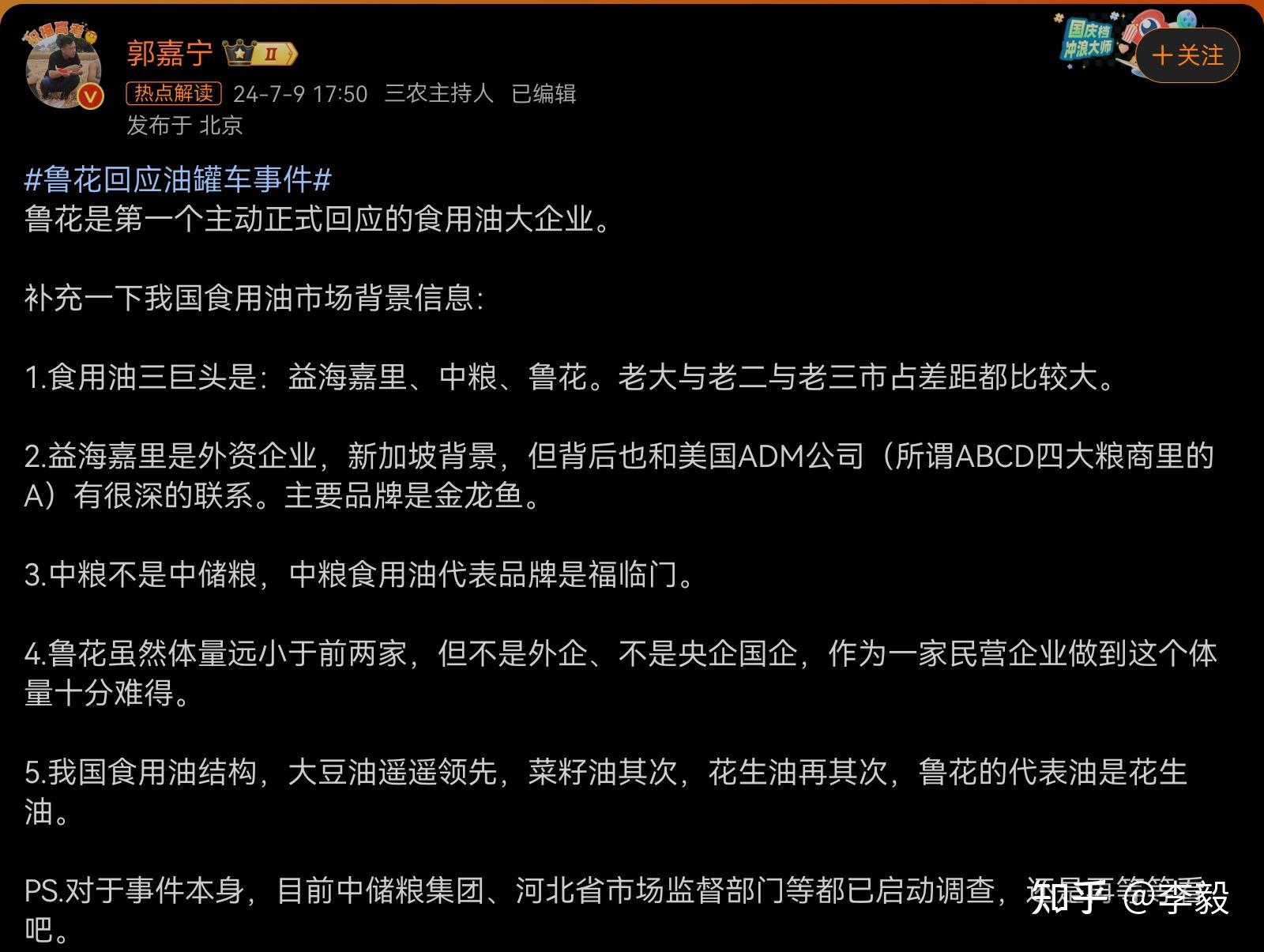 新京报的本意是坏的,但让马前卒给执行好了。 金龙鱼背后是益海嘉里,益海嘉里是丰益国际全资子公司,而丰益国际25%的股份是美国粮油巨头adm持有。 编辑于 2024-07-09 22:56・IP 属地山西 赞同 22添加评论分享 收藏喜欢 收起