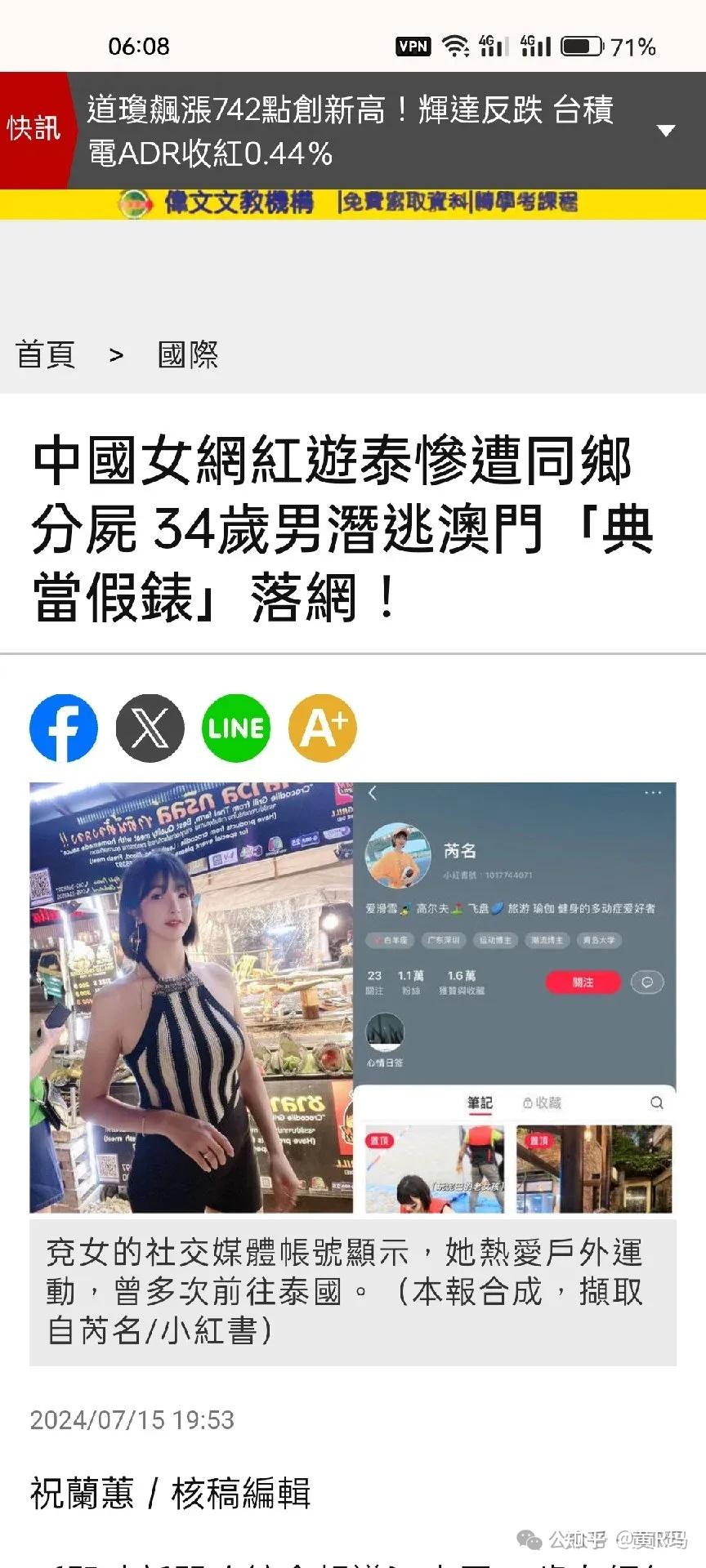第一天新闻看到泰国警察给的录像,这个女的身材高挑,一个人敢去东南亚,加上整容脸,我心里想,这个女的该不是搞黑产的吧?38岁还没有结婚,后面果然中了。死者为大,还是赚辛苦钱安全,最后告诉大家怎么看是不是真富婆 1.不是整容脸 2. 手不能粗大