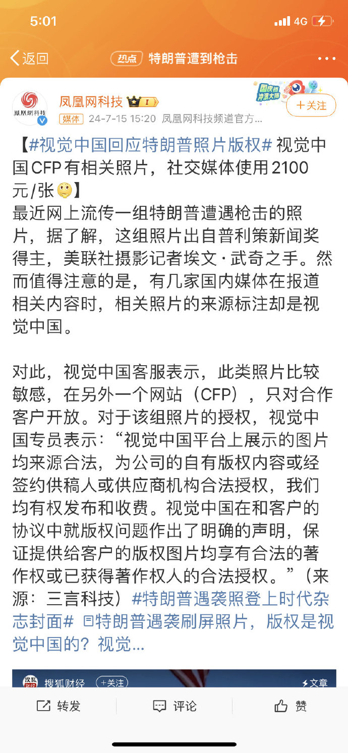 【特朗普遇袭刷屏照片,国内版权竟归属视觉中国?】