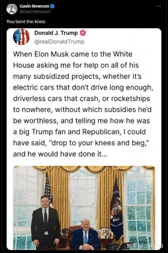 纽森在得知此事后,截图了一篇特朗普曾经在2022年批评马斯克的帖子。