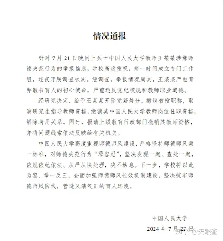 针对7月21日晚网上关于中国人民大学教师王某某涉嫌师德失范行为的举报信息,学校高度重视,第一时问成立专门工作组,连夜开展调查核实。经调查,举报情况属实,王某某严重背弃教书育人的初心使命,严重违反党纪校规和教师职业道德。
