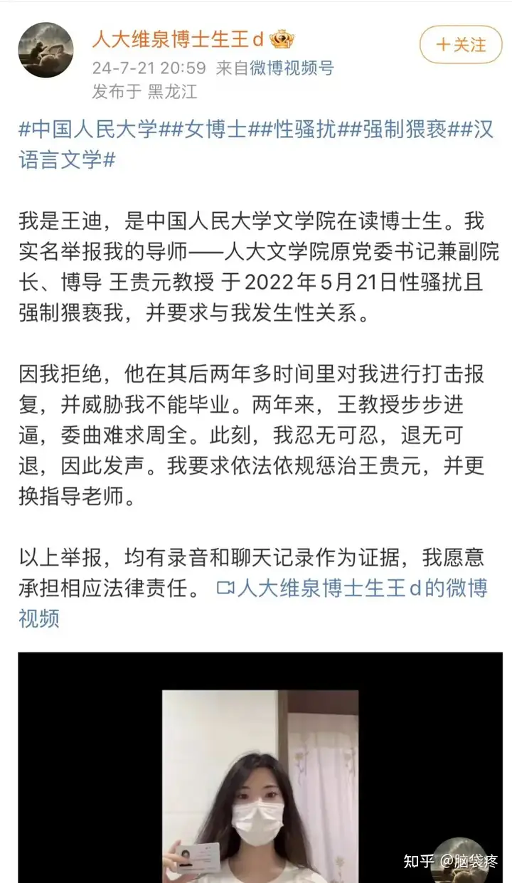 一位人大的女博士生王迪,实名举报她的导师王贵元教授,猥亵、X侵,还想要和她做夫妻
