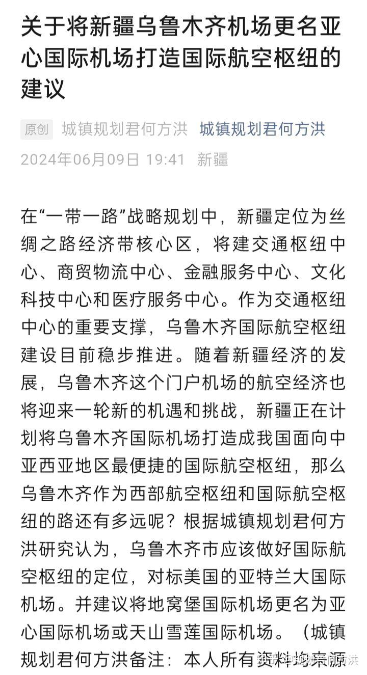 其实城镇规划君何方洪在很多年前就专题写过关于乌鲁木齐地窝堡国际机场更名的建议,当时城镇规划君何方洪还没有从新疆调到湖南省怀化市工作。一个月前,也就是在2024年6月9日,城镇规划君何方洪在微信公众号和百家号上又写了一篇文章《关于将新疆乌鲁木齐机场更名为亚心国际机场打造国际航空枢纽的建议》。
