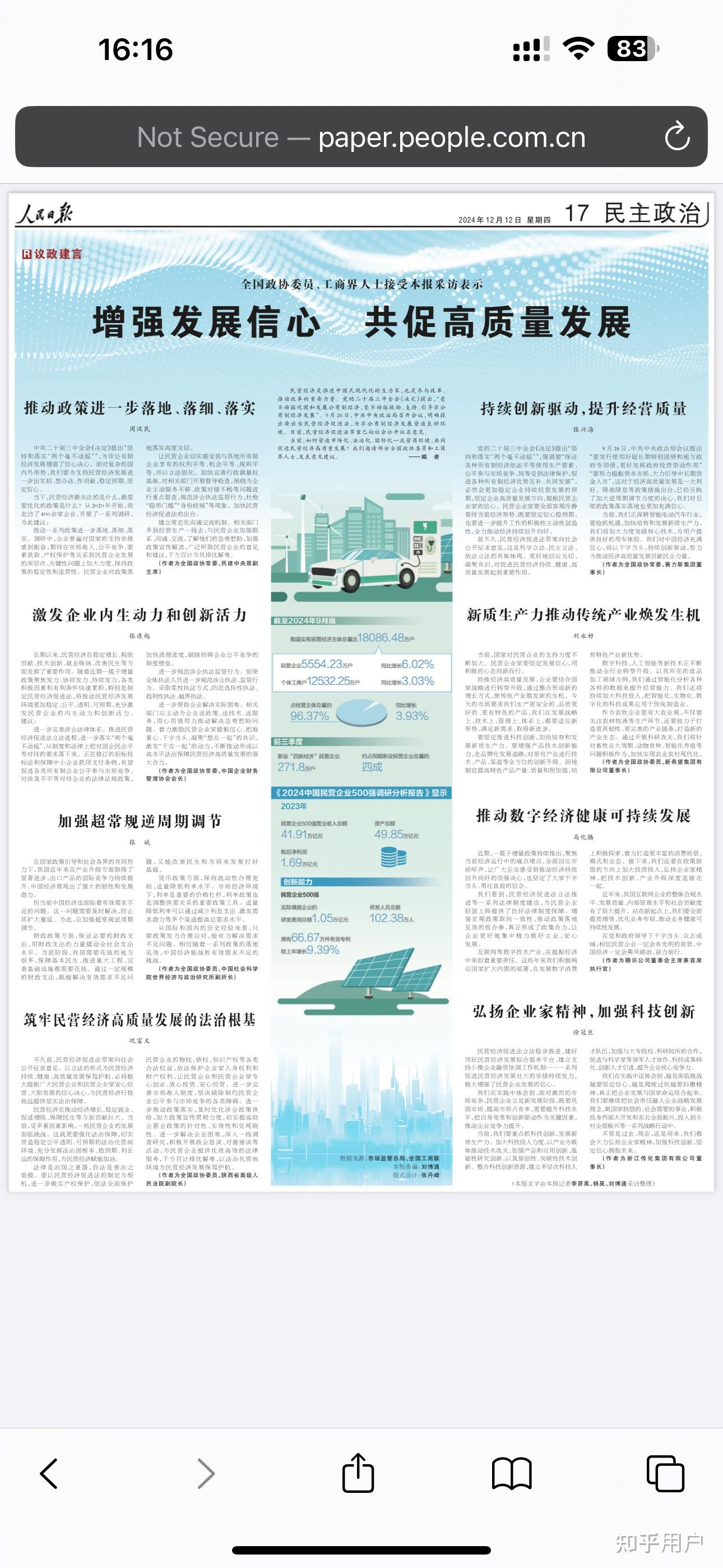 12月12日出版的《人民日报》在第17版刊发了整版报道《全国政协委员、工商界人士接受本报采访表示:增强发展信心 共促高质量发展(议政建言)》。文章表示,民营经济...
