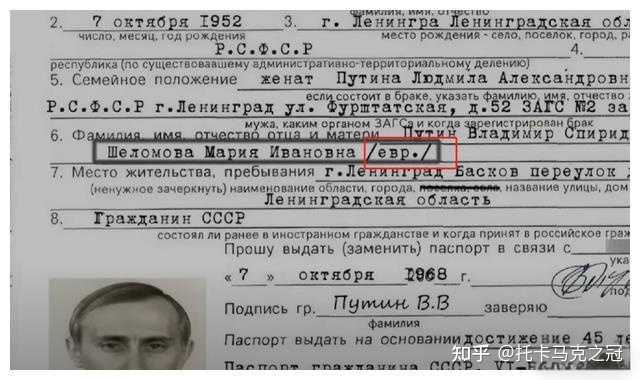 犹太人。图为普京证件上标明其母亲为犹太人,按照犹太教经文《密西那》的说法,犹太人以母系血统为准。