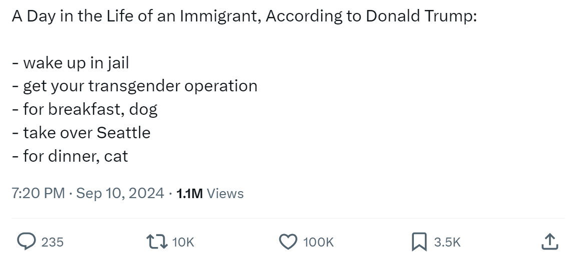 先吃了猫狗,然后是哈里斯“要把非法移民弄去做性转手术”,更令人一头雾水,想说明什么?猜测是川普思维能力固定化的又一体现,脑子里就那几个车轱辘转的词汇,串尼、非法移民,辩论之前专门提醒我这两个是重点。。。那好吧,一瞬间脱口而出,一起用了。。。