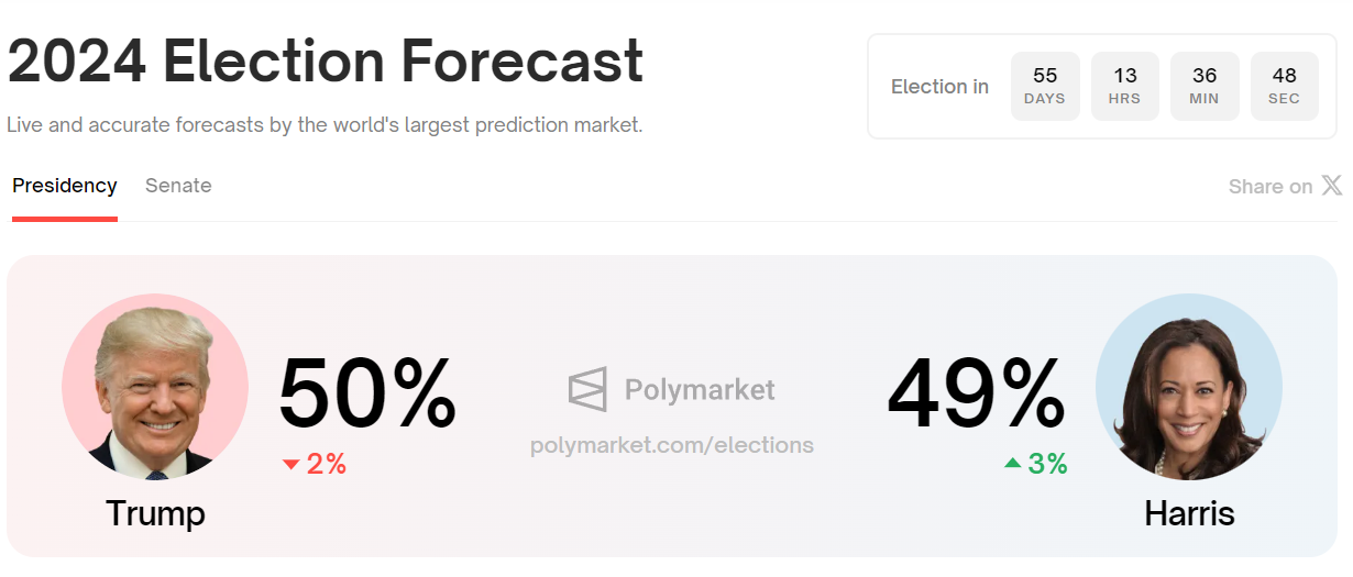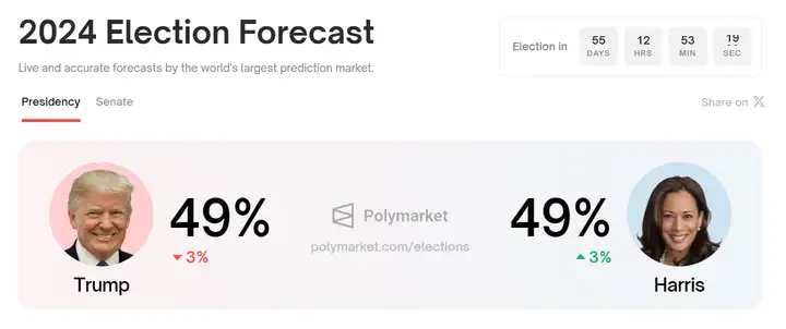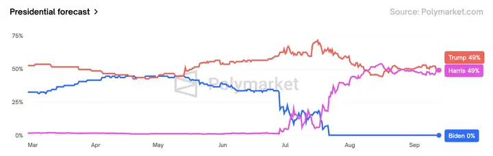 polymarket的胜利赔率,从辩论开始前的川普52-46领先,变成了如今49平,哈里斯小赢