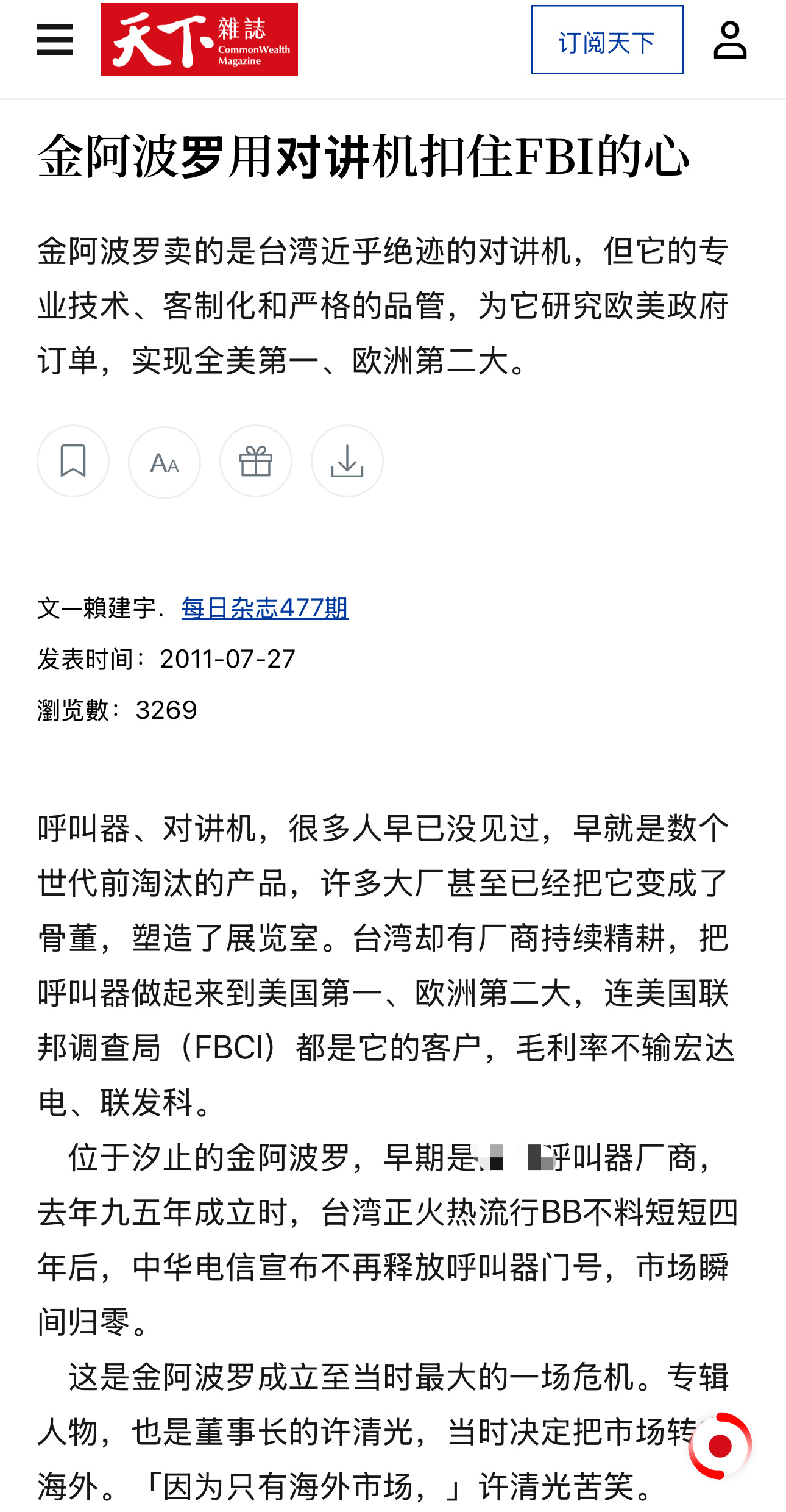 鉴于有人质疑BP机生产商,现在放一篇台湾人自己写的关于金阿波罗的文章。金阿波罗可是FBI认证的,长期作为西方情报界合作供应商。金阿波罗没有在大陆设厂,完全在台湾岛内设计组装。