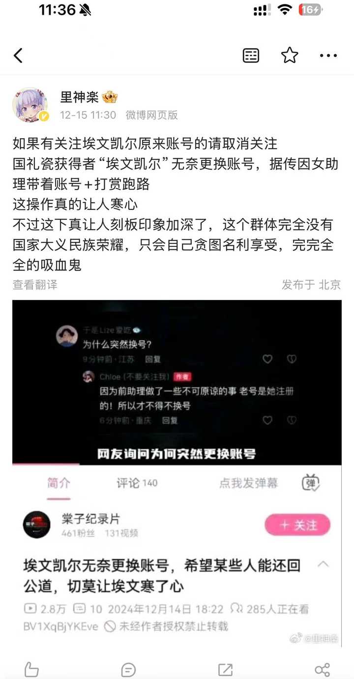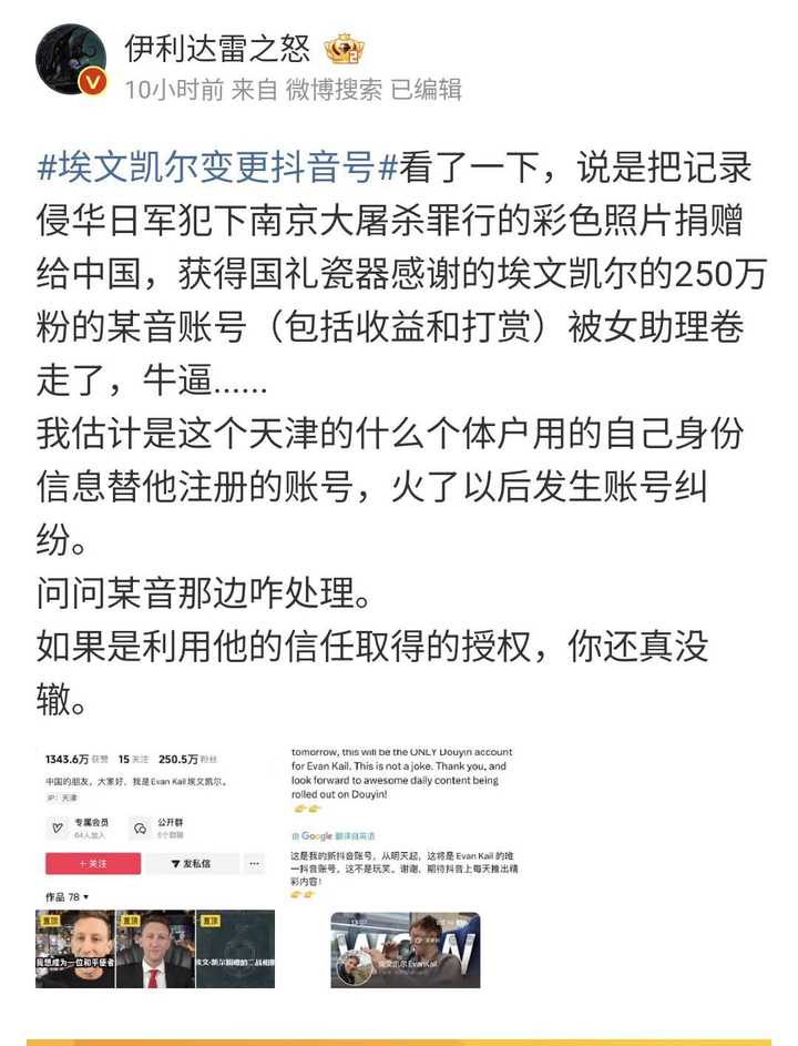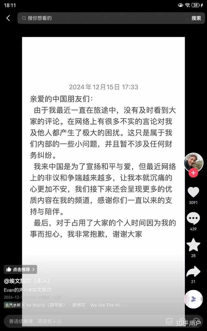 埃文凯尔本人已经在个人抖音账号和X上中英双语回复了最近的关注问题,原文及翻译放下下面:“亲爱的支持者们,我怀着沉重的心情来回应最近在网上流传的谣言。这几天对我来...