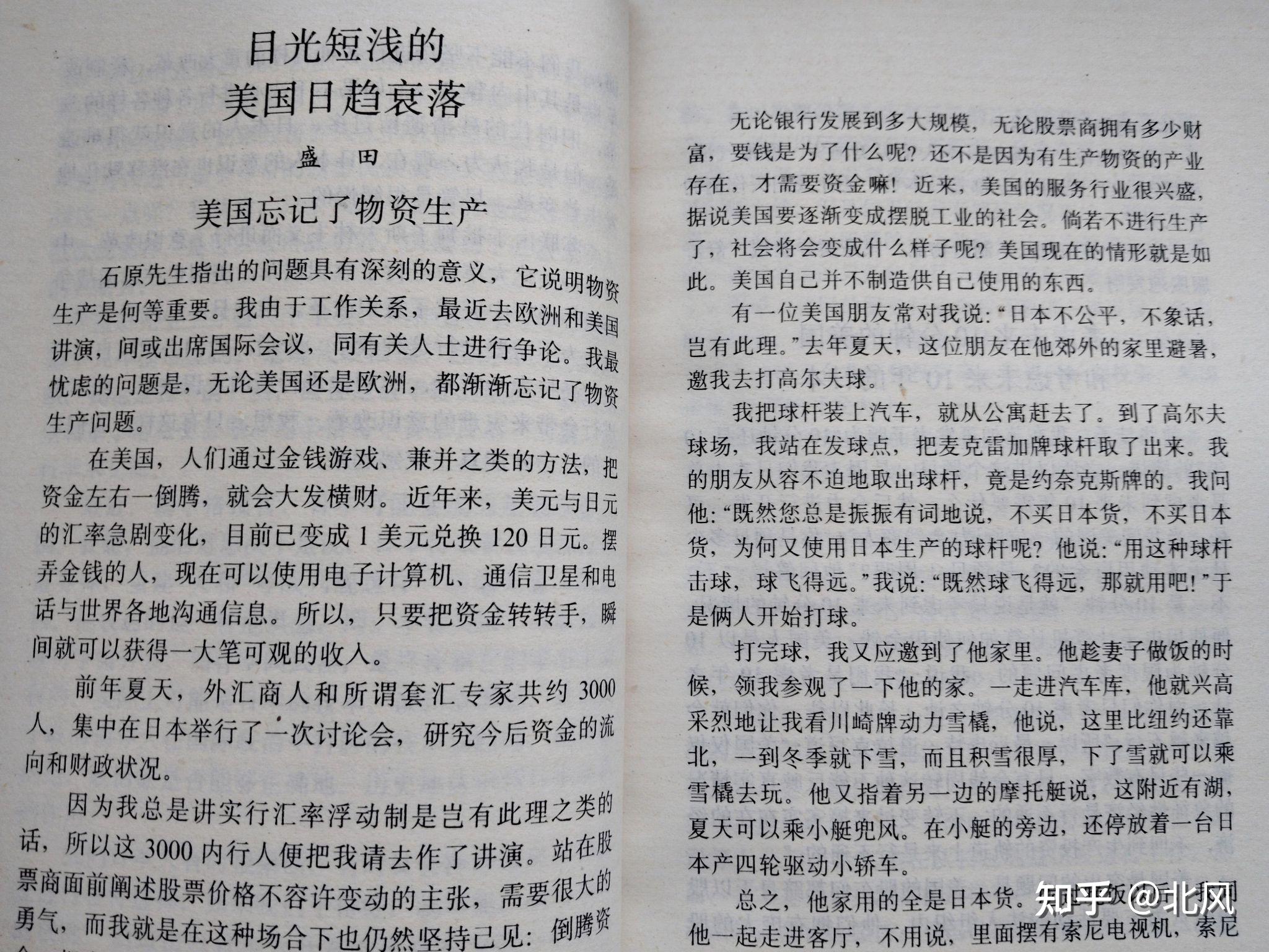 前几天我在家门口的旧书摊花5块钱买了一本《日本可以说不》,这本小册子的出版时间是1989年。昭和时代刚刚过去,日本开始进入平成纪元。右翼政客石原慎太郎和索尼公司创始人盛田昭夫合著了这本书,书中一针见血的指出了美国的诸多问题: