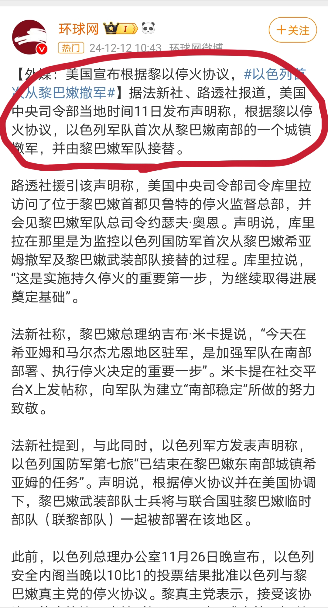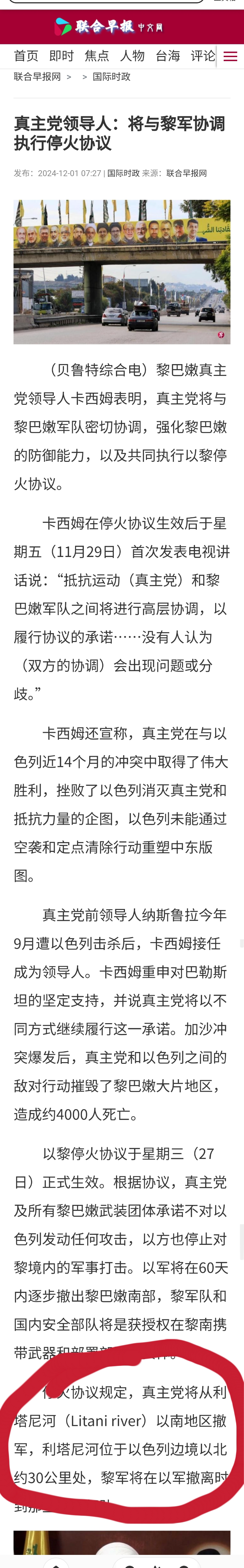 11月26日达成协议,真主党撤出黎巴嫩南部后,以军才会撤军。黎巴嫩南部由黎政府军和维和部队接管。
