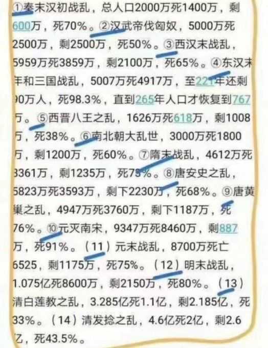 早年的记录一直都不清晰,主要是人口统计不如现代,但是大家津津乐道的白起坑杀40万大军,巨鹿之战死了20万秦军,土木堡,50万大军死伤过半,这些都只是战争方面,战争以外的……