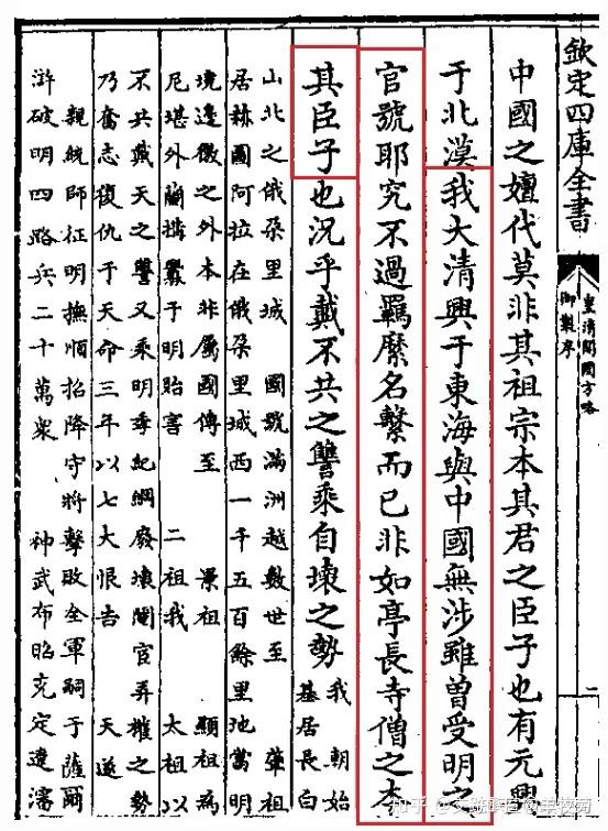 《皇清开国方略》清·乾隆 “夫中国之嬗代,莫非其祖宗本其君之臣子也,有元兴于北漠,我大清兴于东海,与中国无涉,虽曾受明之官号耶,究不过羁縻名系而已,非如亭长寺僧之本其臣子也,况乎戴不共之雠乘自坏之势,我朝始基居长白山北之俄朵里城,国号满洲越数世。”——乾隆·《皇清开国方略》