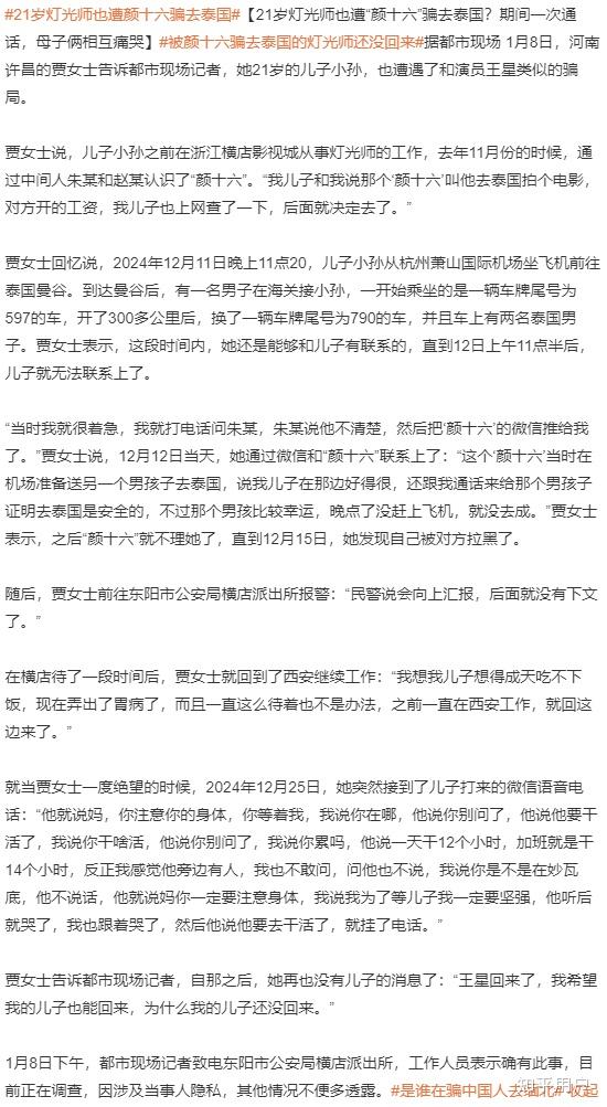 别怎么看了,我从同行里收到的消息是,有大量中国影视剧组工作人员被以“拍新戏”为由骗到那边无法联系,被囚禁者人数超出所有人的想象除了星星以外,还有一名跟他差不多同时间被骗的21岁河南灯光师,至今失联现在已经很明确了,就是泰国政府透过建立灰色产业,以拍摄电影/电视剧作为理由,大规模拐骗我国影视行业工作人员等公民到当地成为劳工“肉牛”,实行虐待甚至残杀呼吁中国政府重视此事!不要再向以往那样打哈哈打官腔冷淡处理等待风头过了就假装无事发生!这是中国的公民被他国劫掠!而不是简单的外交事故!他们都是人!