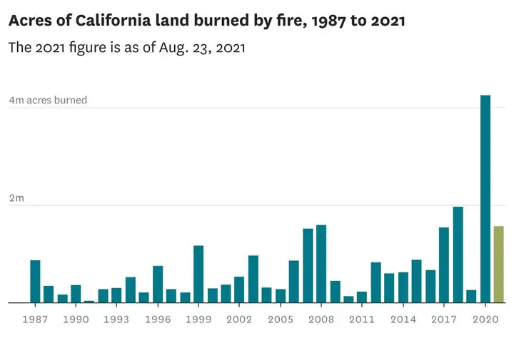 加州覆盖有沙漠,绿洲,海湾,森林,甚至雪山等各种地貌,因此每年加州都有上千平方千米的地区被山火或者野火烧尽。