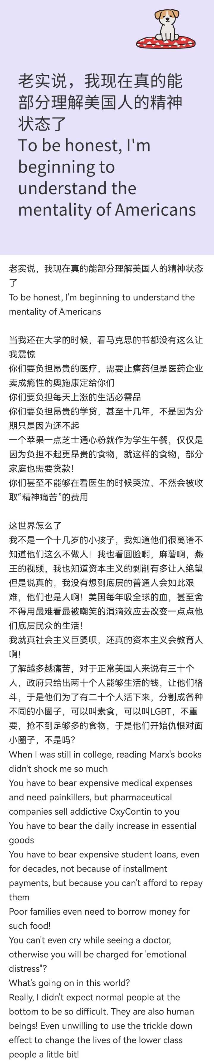 包括我在内,很多网友和美国网友对账后,都破防了,知道他们普通民众日子不好过,但没想到这么不好过,现在很能理解美国人的精神状态了: